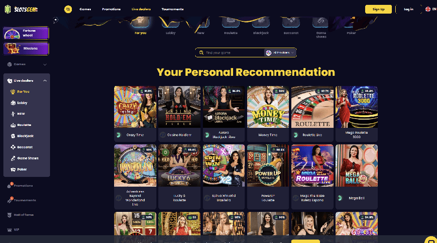 SlotsGem has a good assortment of table games in addition to slots. Digital RNG versions of popular games like blackjack, roulette, baccarat, and poker are available for players to choose from. The live casino section has real-time dealer-hosted games streaming in high definition for people who want a more immersive experience. Live roulette, blackjack, and baccarat tables enable players talk to dealers and other players, making the experience feel like being in a real casino.